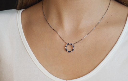 Corona anheng i hvitt 585 gull med diamanter W/SI totalt 0,10 ct. og markiseslipte blå safirer totalt 1,1 ct.