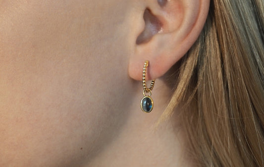 Candy Komplett øredobber i gult 585 gull ink. ørepyntanheng med cabochonslipt london blue topas.